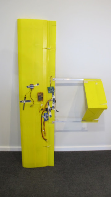 Yellow Jet 758 Grams with remaining Coroplast 2 X 7.4 V 1300 mAh batteries Arduino Nano RX Xbee with antenna, servos and misc hardware. Chamfered the top on the leading edges. All control surfaces cut and hinged. ESC mountedElevator mechanism for EDF jet carbon rod and ballpoint pen ink reservoir seems quite stiff with low backlashSee the video here http://www.youtube.com/watch?v=_Z9wEU6c1F0&hd=1This plane flew pretty poorly unfortunately, but the controller worked well the EDF lacked thrust